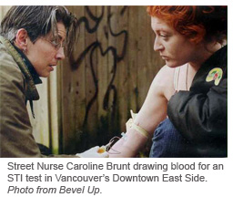 Having the “bevel up” refers to the direction a needle should go into the vein so it causes less harm. Bevel Up: Drugs, Users and Outreach Nursing is a film that follows the street nurse team as they treat residents of Vancouver’s poorest neighborhood. Their approach: compassion and harm reduction. The extremely effective and compelling 45 minute educational documentary is designed to be used in workshop or other teaching settings. (The interactive teaching DVD has 3.5 hours of extra features.) It also has been having a festival life, selling out theatres to broader audiences. The film was a unique collaboration between the BC Centre For Disease Control Street Nurse Program, Canada Wild Productions, and the NFB, and is directed by award-winning director Nettie Wild (FIX: story of an Addicted City, A Place Called Chiapas, and many more).