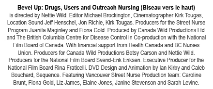 The world that Bevel Up takes us into —the scene on the streets, alleys and hotels of this downtown Vancouver, BC, Canada neighborhood (very close to the soon-to-be 2010 Olympic Village)— can stretch the limits of tolerance and compassion. Yet this is the task: to provide non-judgmental, effective care. Humanizing those who are often stigmatized as less than human is the baseline of reducing harm. This is what Bevel Up in its multi-platform incarnation as a 45 minute documentary, as well as through it’s 3.5 hours of teaching chapters, interviews and topics, shows us. Directed by accomplished filmmaker Nettie Wild, Bevel Up, like it’s title, is gritty and poetic.