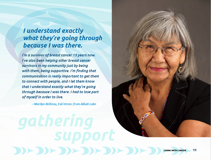 We created a support book called "LIving With Cancer, Everyone Deserves Support" for First Nations and Métis people living with cancer in BC. This was a project created by partners First Nations Health Authority, BC Cancer Agency, the BC Association of Aboriginal Friendship Centres, and Métis Nation BC. It was funded by the Canadian Partnerhship Against Cancer. It was a real honour to interview all the amazing people pictured in the book.